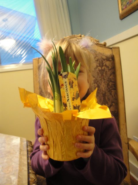 When we got to the van I decided to take her in to the grocery to have a look around and work out those tears. When she stopped at the flower section and kept smelling all the different plants I saw her smile return. Perhaps it was the joy she took in the pretty flowers or the pleasure smelling them gave her… this could have been even more of an effect on me since I have no sense of smell… but the potted daffodils fate to come home with us was a sealed deal when she told me ‘I would take such very good care of the baby flowers.’