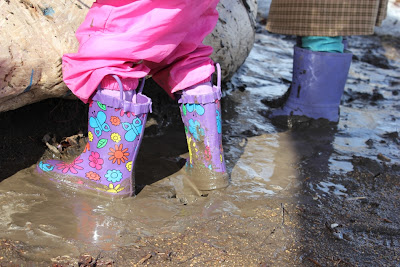 While the park was dry enough they only used the slides and monkey bars a short while.  Most of the our time was spent with sticks in hand exploring the mud.  A couple times the girls worried me, almost toppling over right into the mud, but most of the time we basked in the squishy sounds of mud below our rubber boots.