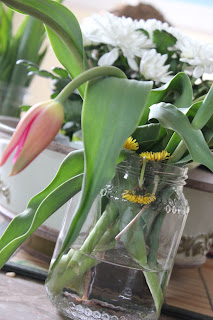 Garnet had found me two colors of tulips and I had been gifted a pot of white flowers by a Scottish gentleman, that my daughters and I sat with at a ‘highlanders tea’, earlier that weekend. The table was thus full of flowers. Not to be out done, my three year old added to the bouquets with his ‘lawn bouquet’, as seen in the below photo… truly heartwarming and not unnoticed by his Mama!