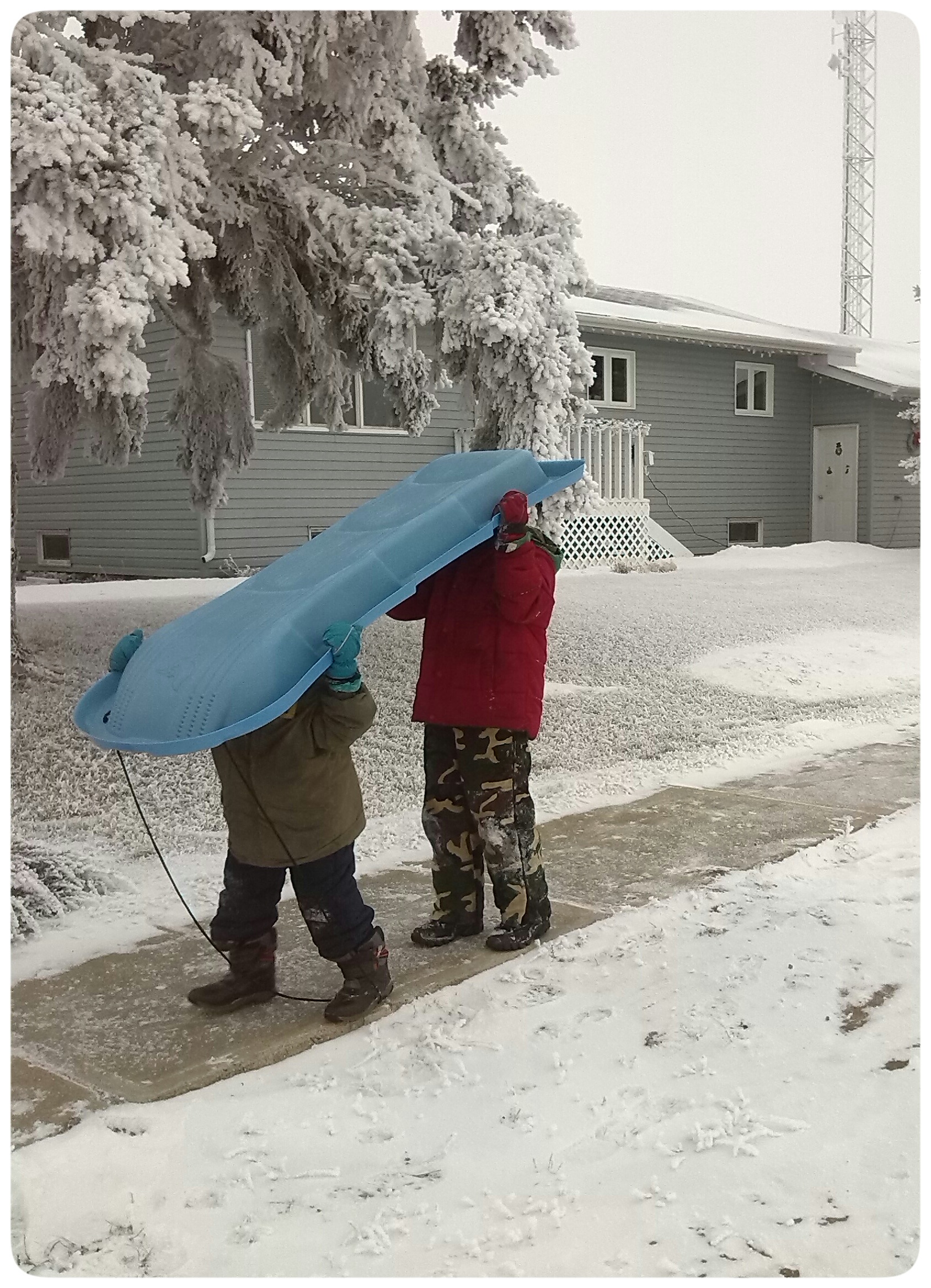 Well written Rebecca. Gives me again the joy of snuggling up in a warm house in Dec with those we love. The boys are so cute with the sled over their heads. I like all the pictures. Love you. Mom.
