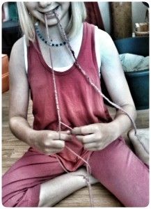 We spent an entire afternoon focused just on making a pair of long braids that would be stitched to the bottom of the curtains so we could tie the pompoms to them. We came up with an interesting method to speed this process up that involved holding the yarn in our teeth and braiding while the other person rhythmically combed the braid so it wouldn’t get tangled with the movement involved in braiding.