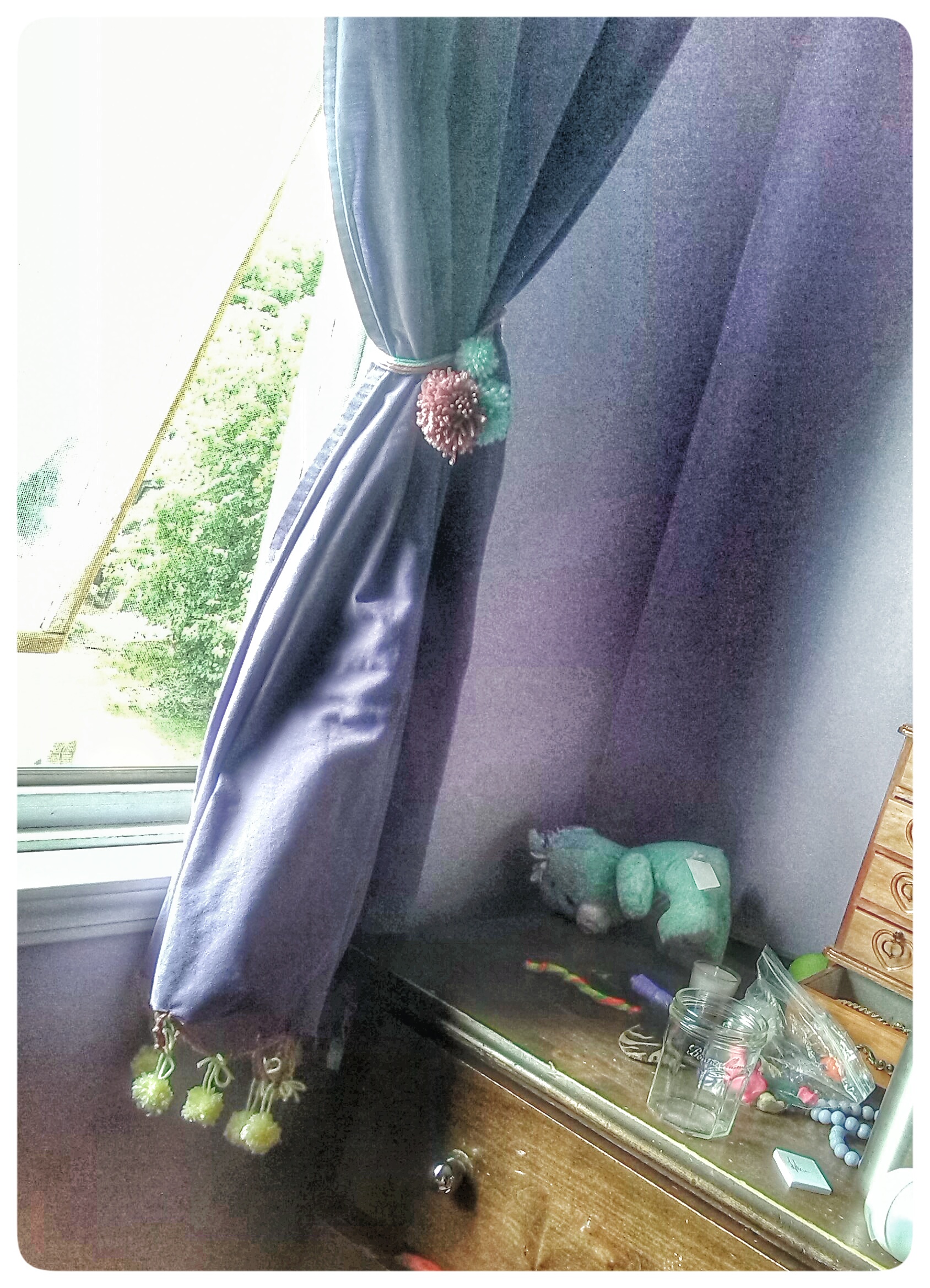My eldest daughter and I made about 30 pompoms after hunting through our big bag of different yarns. We settled on yellow for the majority (yellow being her favourite color) then a rustic pink and bright blue for the curtain tie backs. With the aid of a long fork we had a uniformed collection of pompoms to hang along the bottom of the curtains.