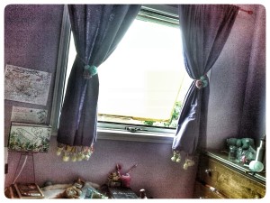 Another whole afternoon was spent stitching the braids to the curtain’s and then tying on each little pompom as equally spaced as possible. My hands were cramped more from this task then any other. Hanging the curtains involved climbing, grunting and sweating in the summer heat (the very heat that made these double layered curtains necessary to ensure relief from summers on slot). After I finally hung the curtains and sighed in relief my eldest son walked in and praised the result, closely followed with the comment, ‘I need curtains too. I am excited to see what you decide to do with them to make them AS unique”!