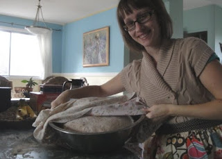 Pounding the dough first thing in the morning wakes me up and is a good work out. I then feel great anticipation as I gently place it in my grandmothers extra large bread bowl and wrap it. It is wrapped in my precious (and otherwise now unused) baby blankets. Cute and cozy the dough sits above the dish washer (where it is toasty warm) rising nicely while the washer chugs away. Panning the bread is done by happy hands, thankful to be productive on a dull and gloomy day.