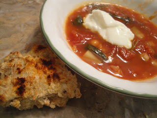 - Top with Greek yogurt, add more black pepper to enhance the soups flavor and serve with the Parmesan biscuits.